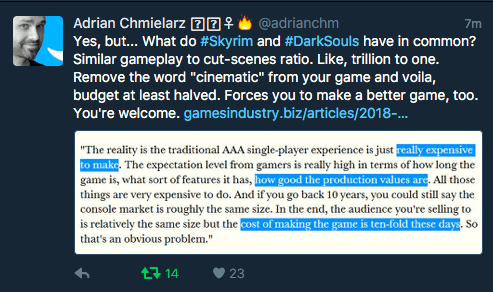 Before I break down a few reasons why this is such a serious issue and suggest a few remedies, consider this tweet by the designer of such diverse titles as The Vanishing of Ethan Carter and Bulletstorm: